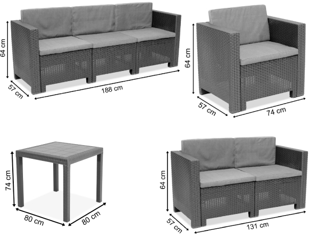 Красив комплект. Лесно се сглобява. Малко тънки възглавници, но материалът не се мокри при лек дъжд. Не съм проверявал в дъжда.